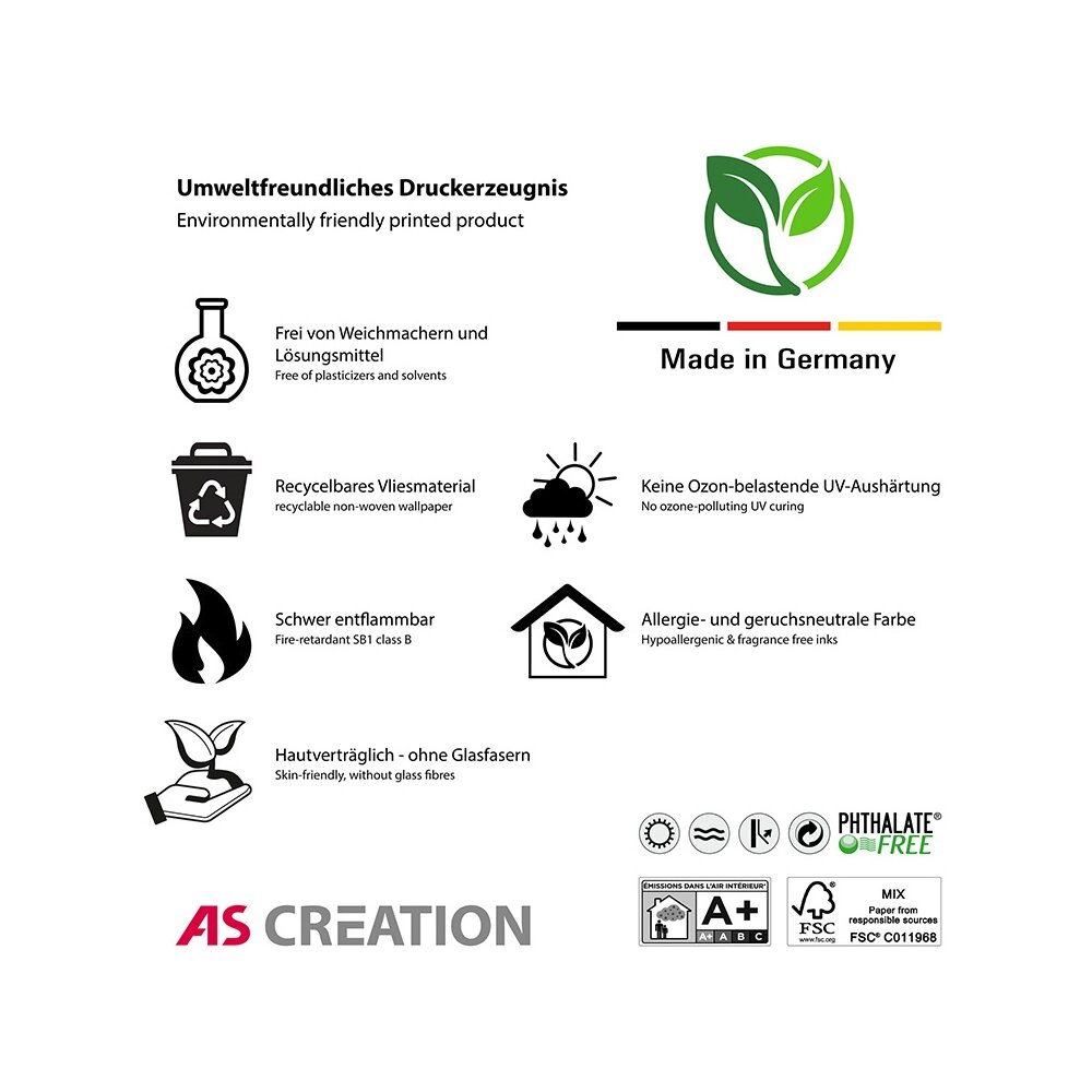 Bitte beachten Sie, dass die auf unseren Bildern dargestellten Farben aufgrund unterschiedlicher Lichtverhältnisse beim Fotografieren sowie verschiedener Bildschirmdarstellungen leicht von den tatsächlichen Tapetenfarben abweichen können. Auch produktionsbedingt sind geringe Farbabweichungen zwischen der abgebildeten und der gelieferten Tapete möglich.